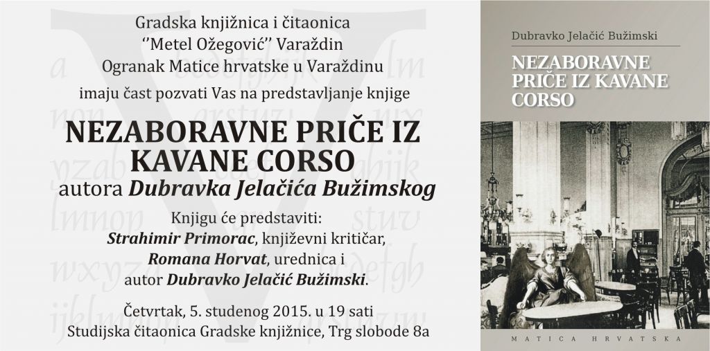 U četvrtak, 5. studenoga, s početkom u 19 sati u Studijskoj čitaonici Gradske knjižnice Metel Ožegović u Varaždinu, biti će predstavljanje knjige Nezaboravne priče iz Kavane Corso autora Dubravka Jelačića Bužimskog.