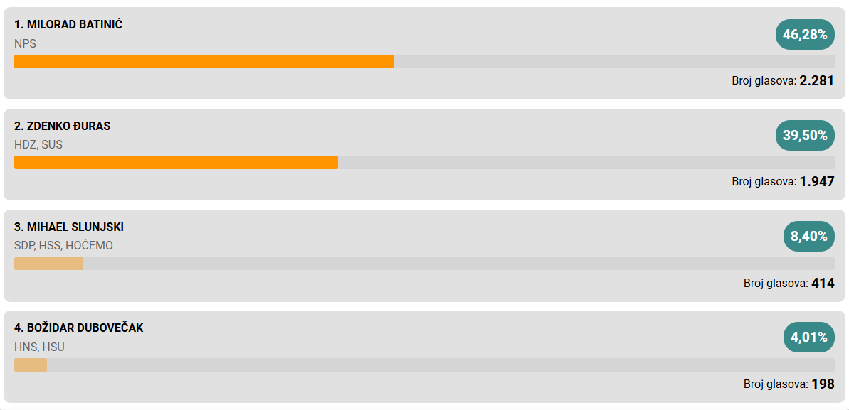 U drugi krug idu Milorad Batinić i Zdenko Đuras.