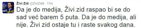 15:27. Na Facebook stranici i Tweeter profilu Živog zida oko 15.15 objavljena je kratka reakcija i komentar te stranke: – Da je do medija, Živi zid raspao bi se do sad barem već pet puta. Da je do medija, ali nije. Živi zid ostaje tu i raste svakog dana.