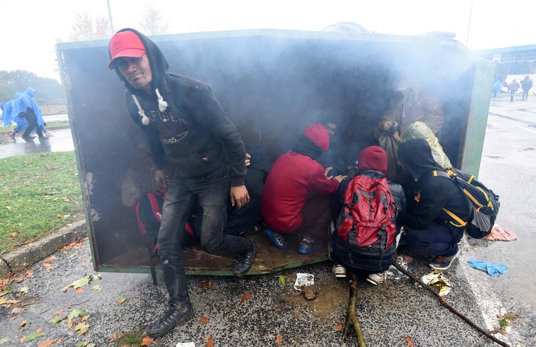 Izbjeglice, među kojima ima i veliki broj djece, na kiši hladnoći čekaju ulazak u Sloveniju.