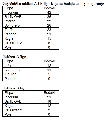 U susretima B lige Barflay OVB pobijedio je ekipu Poleta 11-5, te potvrdio drugo mjesto u ukupnom poretku B lige, a u malom derbiju između dvije Šemovečke ekipe pobjedu protiv Oktana 3 ostvarila je ekipa Kugle rezultatom 11-5.