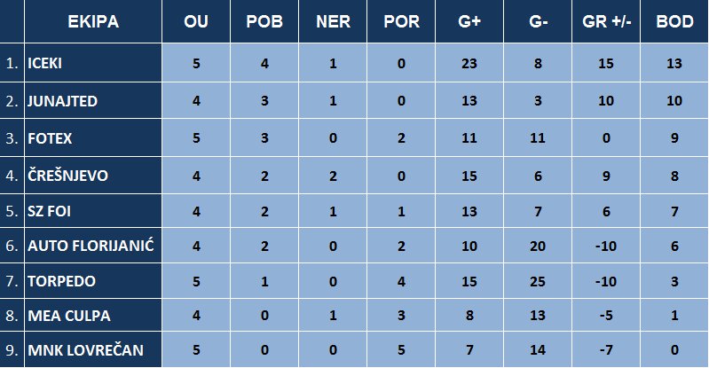 Peto kolo TTS mininogometne lige održalo se u ponedjeljak, 21. studenog. U prvoj utakmici Iceki su potvrdili vodeće mjesto još jednom pobjedom ovaj put nad momčadi MNK Lovrečan. Konačan rezultat utakmice bio je 2:3 u korist Iceka.