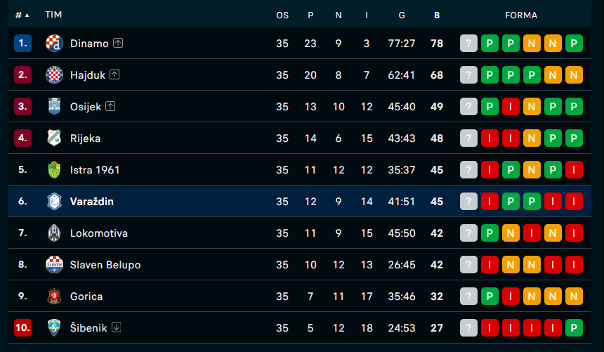 bodova. Ni gol razlika ne ide u prilog Varaždinu jer su na -10,