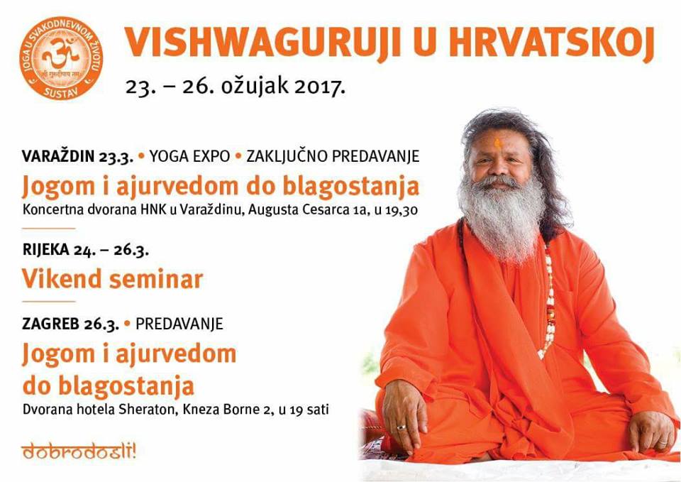 Predavanjem koje će na temu ‘Jogom i ajurvedom do blagostanja’ održati 23. ožujka u 19.30 sati u Koncertnoj dvorani varaždinskog HNK-a NJ.S. Vishwaguruji započinje svoju četverodnevnu turneju po Hrvatskoj na kojoj će, uz Varaždin, posjetiti i Rijeku i Zagreb.