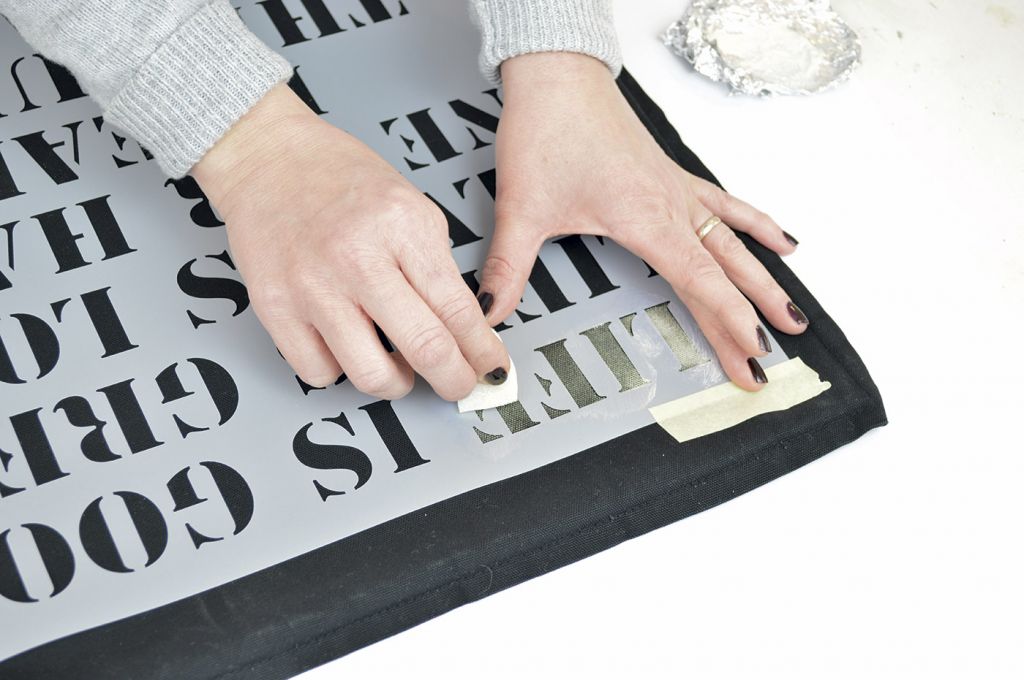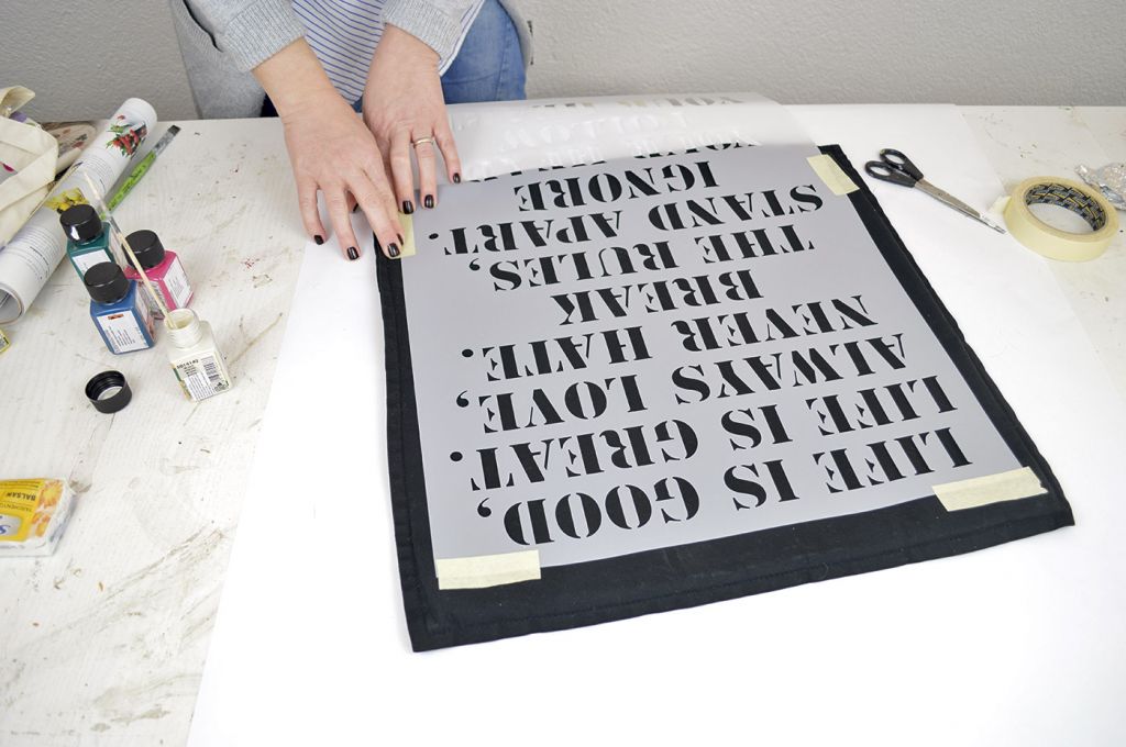 PRVI KORAK: Jastučnicu stavite na čistu ravnu podlogu. Postavite šablonu na mjesto gdje želite otisnuti tekst ili motiv sa šablone.