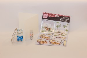 Potreban materijal: A4 decoupage set Anitas-DoCraft, snijeg pasta, bijeli glitter, dvostrana ljepljiva traka, 3D ljepljiva traka, prozirne naljepnice pahulje