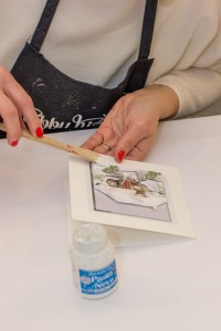 DRUGI KORAK: Da bi slika bila što uvjetrljivija pomoću špatule na pojedine dijelove motiva: krov, drveće, nanesite malo snijega u pasti.
