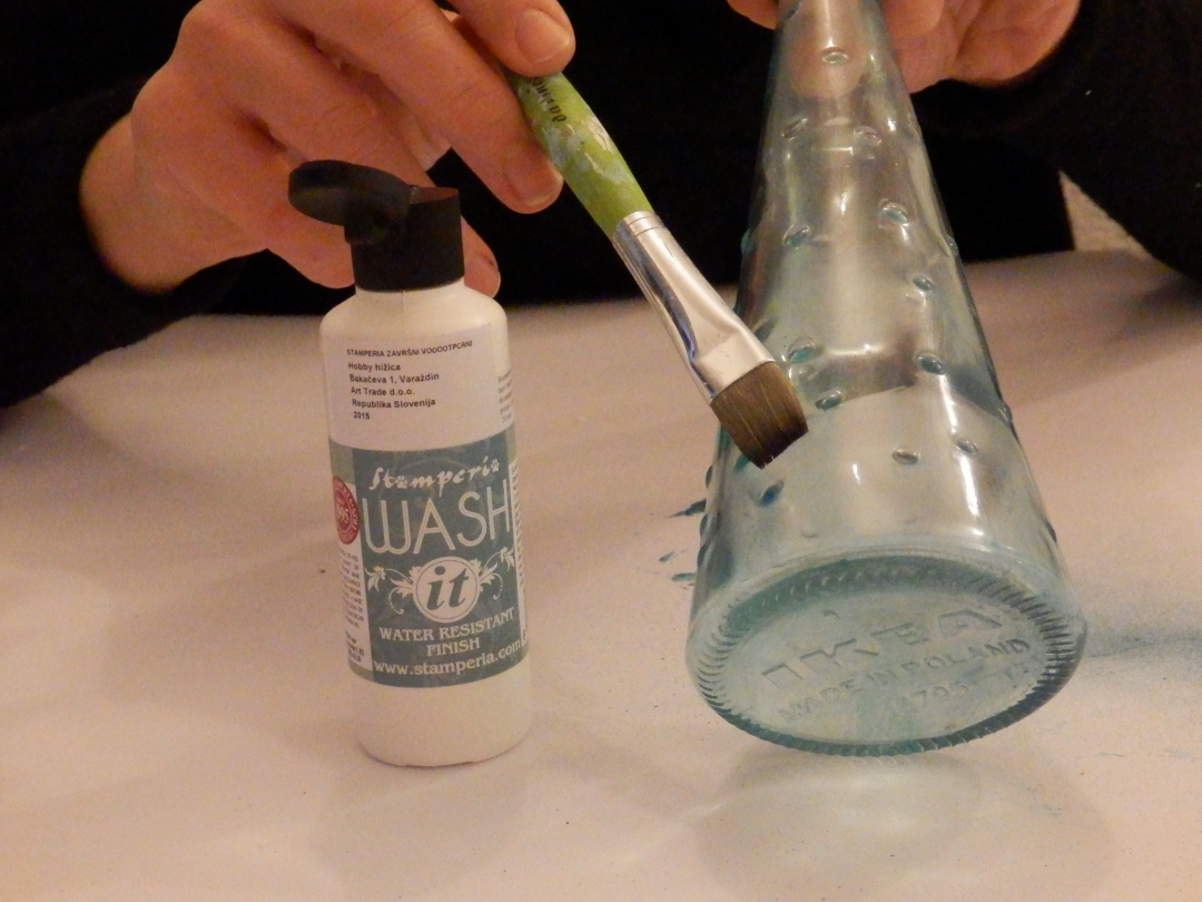 TREĆI KORAK: Nakon što je tinta suha staklenku je potrebno prelakirati zaštitnim vodootpornim lakom Stamperia, koji nakon što se osuši je potpuno vodootporan i staklenku možete oprati i u perilici posuđa.