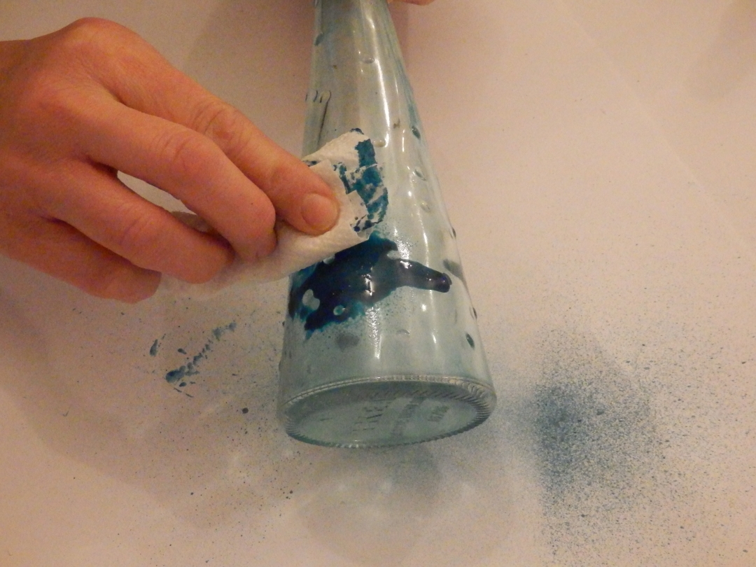 PRVI KORAK: Zaštitite podlogu na kojoj radite. Očistite staklenku i nanesete tintu u spreju i jednom sloju.