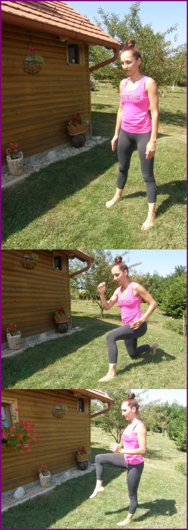 Prednoženje dok ste jednom oslonjeni na stojnu nogu, drugom izvodite pokret. (45sec na svaku nogu).